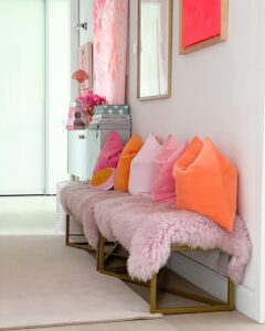Arbeite mit wenigen Farben. Nutze zwei oder drei Farben der gleichen Farbfamilie z.B. beige, braun und weiß oder verwende eine Farbe und eine Akzentfarbe (z.B. beige und salbeigrün). Mein Tipp: geh in ein Baumarkt und schau dir bei den Wandfarben die Farbpaletten an. Suche dir hier 2-3 Farbkarten raus, die miteinander harmonisieren. Wenn du es z.B. je nach Jahreszeit farbenfroher magst, dann bleibe bei einer Farbfamilie (wie im Beispiel weiter unten im Flur) und nehme Farben die zusammenpassen wie: sanftes apricot, orange und pastellrosa. Hier kannst du Details immer wieder anpassen z.B. Kissenbezüge oder Decken.